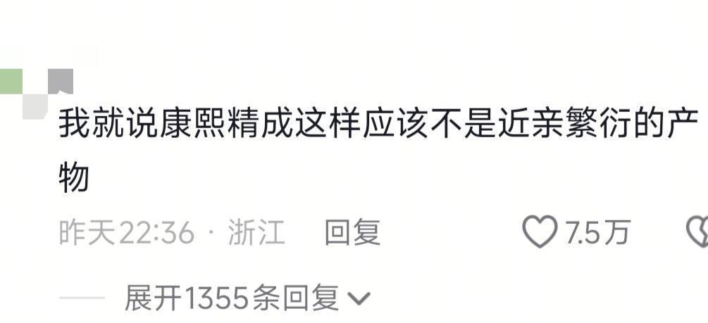 总之,这个消息一出,网友们就展开了热烈的讨论。吃瓜第一线的群众们对这些事都是怎么看的呢?我们一起来看一下。下面这位网友的反应也是特别真实了。这话说的没错,康熙那么聪明,他的儿子们也都那么优秀,九子夺嫡,哪个不是人中龙凤?这么一看,他们家确实不像jin亲结婚的产物。那孝庄多聪明,洪承畴还科举出身,从智商上来说,康熙还确实挺像他们的孩子。