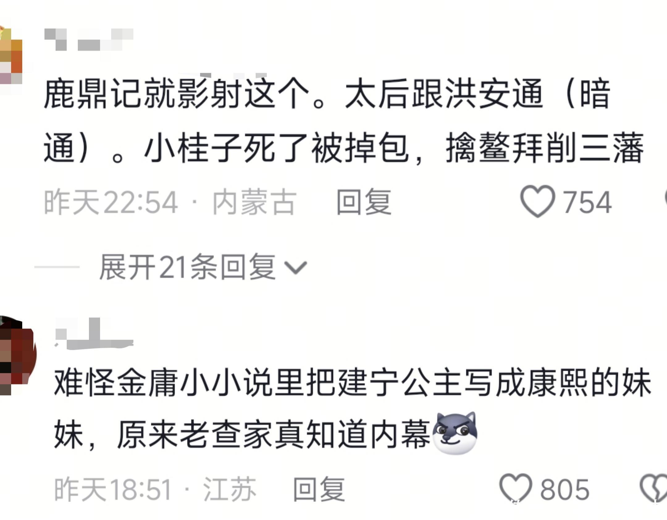 据说金庸老先生是海宁包衣出身,对清朝的事可能会有更多的了解。在他的鹿鼎记中,太后和明教的洪教主有一定关系,然后康熙有个妹妹叫建宁公主,历史上建宁公主好像是他姑姑,而且鹿鼎记在某种方言中,听着挺像绿顶记?所以,老先生是不是真的知道些什么?