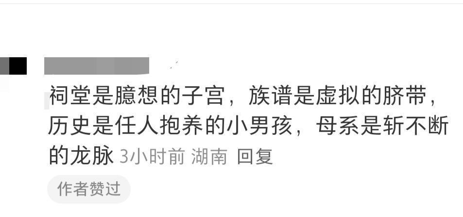 下面这段话简直说的太妙了。真的让人忍不住狠狠点个赞。“祠堂是臆想的子宫,族谱是虚拟的脐带,历史是任人抱养的小男孩,母系是斩不断的龙脉。”这不是在特意强调什么,但其实也没有必要特意执着什么,几千年来,那些礼教礼法对女子的规训,终究是一场笑话!
